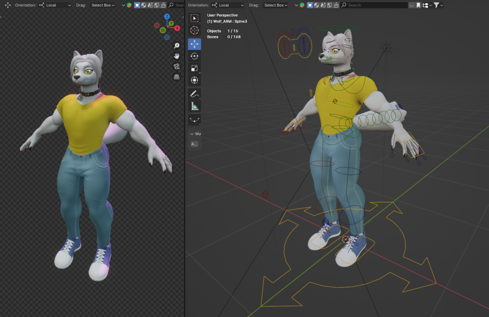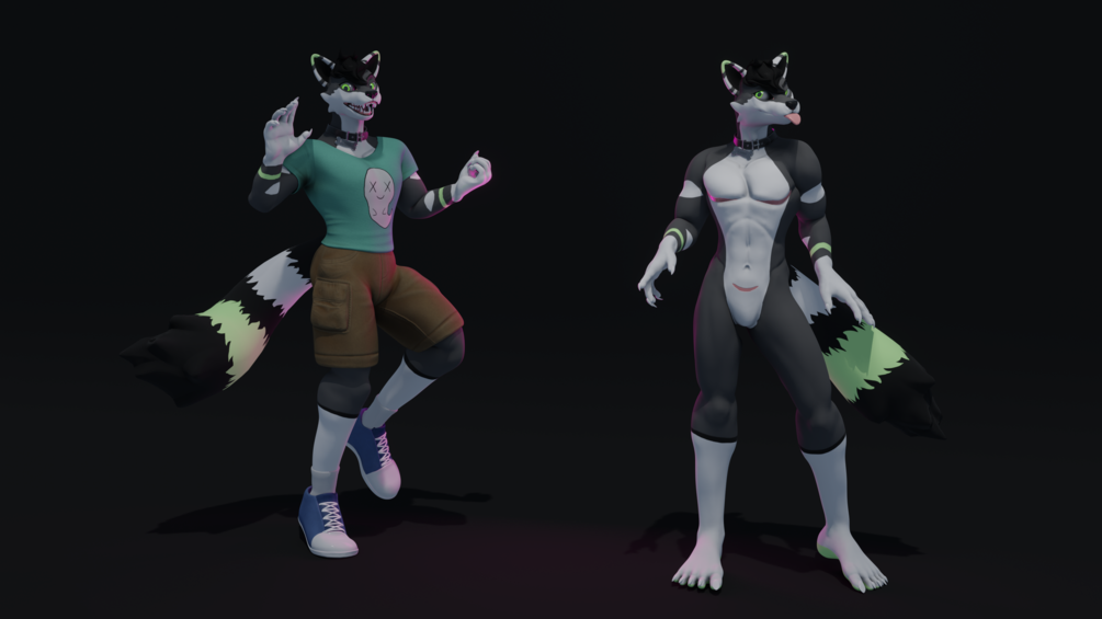 It's a base model, which you can customize however you like. It comes with Substance painter files with different patterns for coat, scars, paint and freckles, which allows you to make your original canine character. The model itself has more than 70 shape keys for different body shapes, face shapes and facial expressions. Same goes with the eyes and clothing. And for those who prefer to use some ready textures, there are 9 sets for the body, 8 for the eyes (or 16, if you use emmission maps for diffuse colors), 7 for the hair and even more for the outfits!