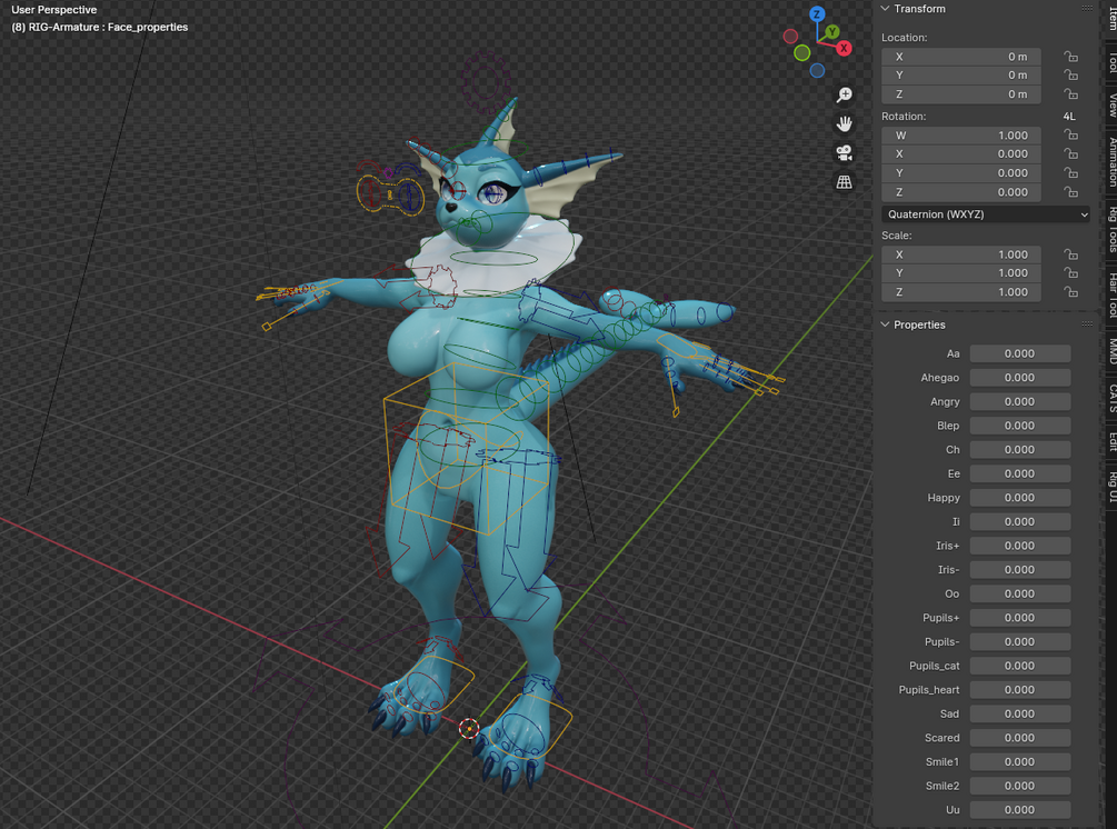 It has an advanced rig and many shape keys for body shapes and facial expressions. Several different bodies, 3 texture sets for the body and 6 for the eyes